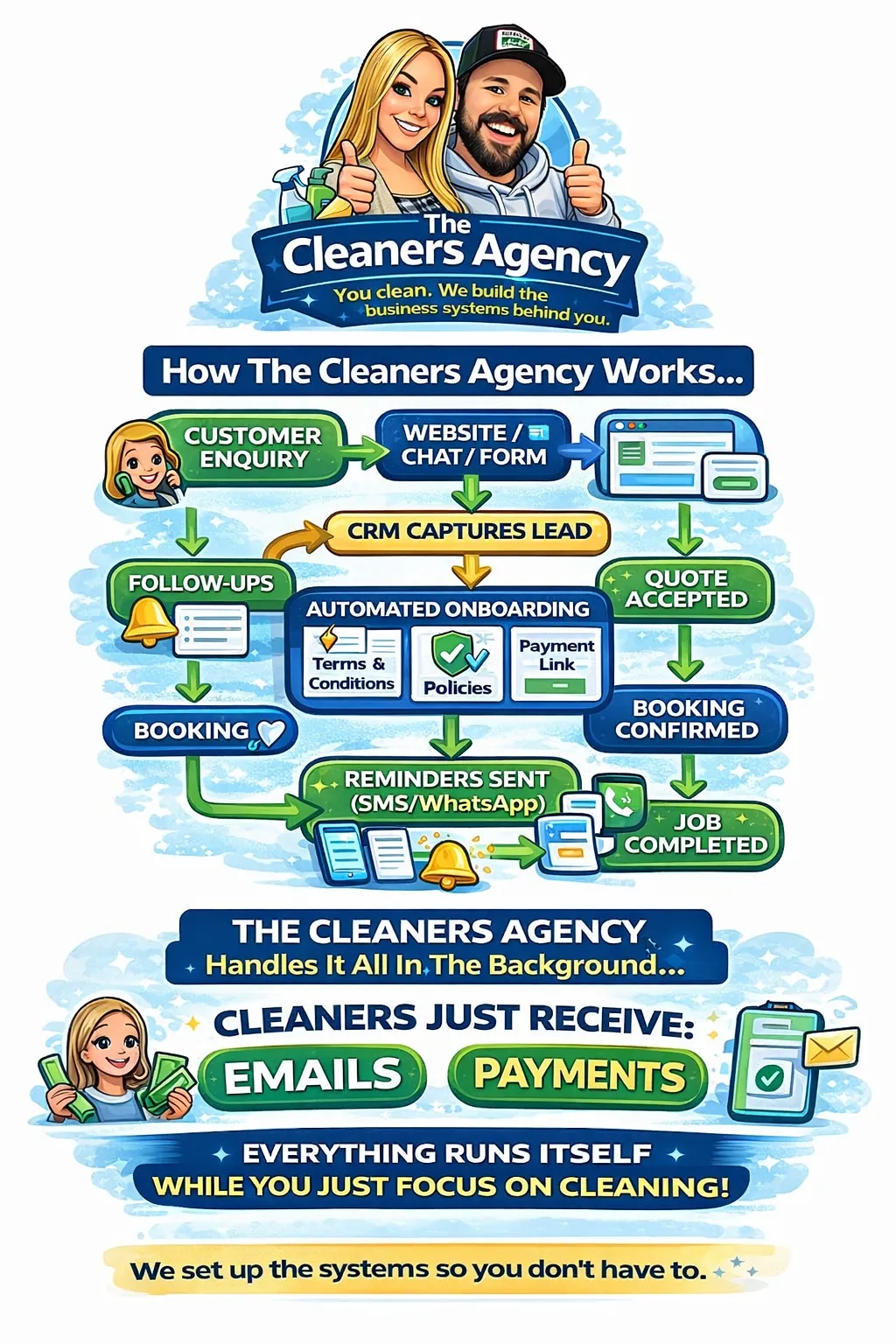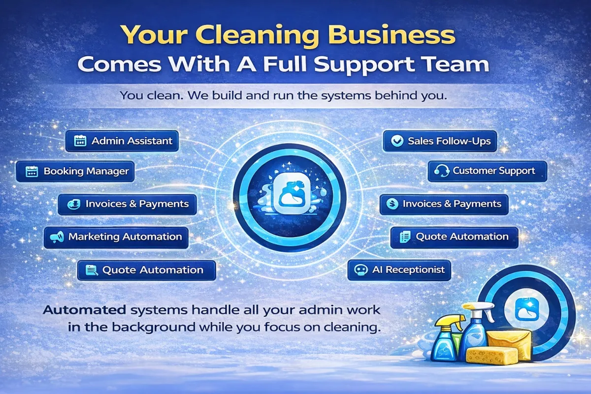The Cleaners Agency helps cleaning businesses run smarter. We build automated systems that handle enquiries, quotes, client onboarding, reminders, payments, and follow-ups automatically. That means less admin, fewer missed opportunities, and a business that runs smoothly while you focus on cleaning.